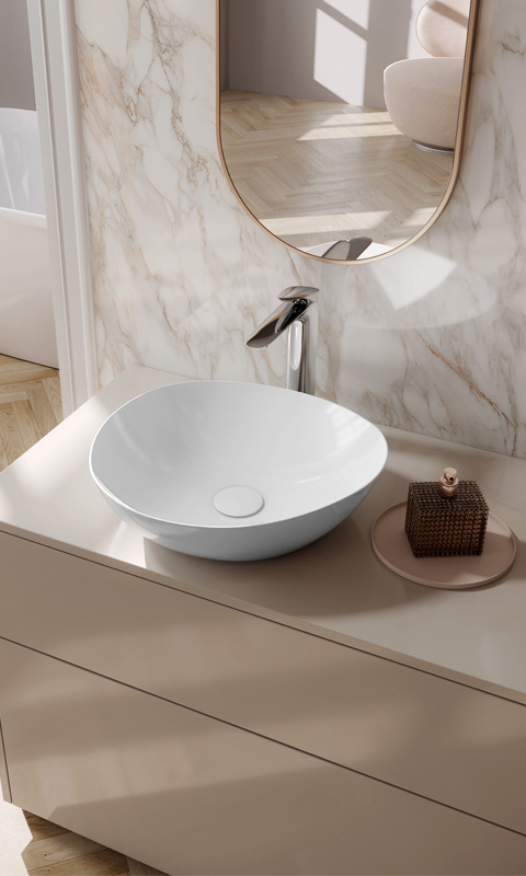 La superficie integra la tecnología CEFIONTECT, un esmalte cerámico de suavidad microscópica que impide la adherencia de residuos y preserva la higiene del lavabo. Este modelo de sobreencimera incluye rebosadero y está diseñado para una instalación limpia con grifería de caño alto o empotrada.