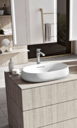 - Instalación sobre encimera que destaca la pieza como elemento central del baño.