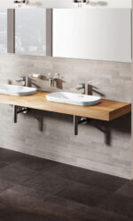 El Lavabo Neorest® de TOTO combina una estética minimalista con la innovación técnica de la firma. El uso de LINEARCERAM permite una estructura de paredes extremadamente finas y bordes de alta precisión, manteniendo una resistencia estructural muy superior a la cerámica convencional. Gracias a las propiedades de este material, el diseño de sobre encimera se integra con ligereza visual sobre la superficie de madera, aportando una presencia arquitectónica definida.