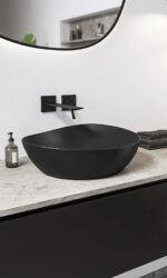 La superficie oscura resalta la geometría del modelo Asymmetric, ofreciendo una presencia definida y elegante sobre la encimera. Este acabado no solo define su carácter contemporáneo, sino que simplifica el mantenimiento diario al reducir la visibilidad de marcas superficiales. Su silueta de líneas curvas y superficie continua garantiza una estética depurada y fluida, integrándose con naturalidad en espacios que combinan texturas naturales y elementos técnicos. De este modo, la pieza mantiene la precisión de su diseño y su resistencia estructural frente al uso diario.