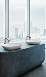 - Configuración integral sin orificio para grifería ni rebosadero, priorizando la síntesis formal.