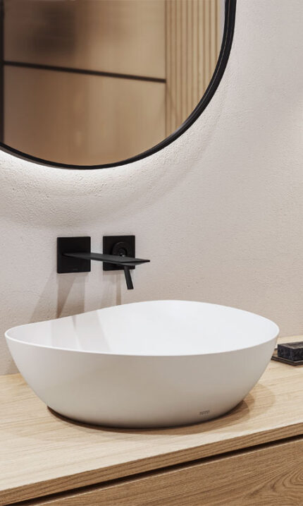 El modelo WU de TOTO destaca por un diseño redondo de paredes esbeltas que aporta un volumen ligero al conjunto del baño. Al prescindir del orificio para grifería, ofrece una mayor libertad de planificación, siendo idóneo para combinar con grifería de pared o de caño alto.