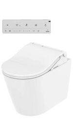 La gestión del confort se completa con un motor de descarga automática que permite un ciclo de uso sin contacto físico, adaptándose a la estructura sin reborde (RIMLESS) del inodoro para facilitar el mantenimiento. Mediante el mando a distancia, el usuario accede al control de un calentador de flujo continuo para un suministro de agua caliente ilimitado, junto a un filtro desodorizante de carbón activo de alta capacidad. El sistema asegura una precisión mecánica a largo plazo mediante programas de mantenimiento y descalcificación integrados en el mecanismo.